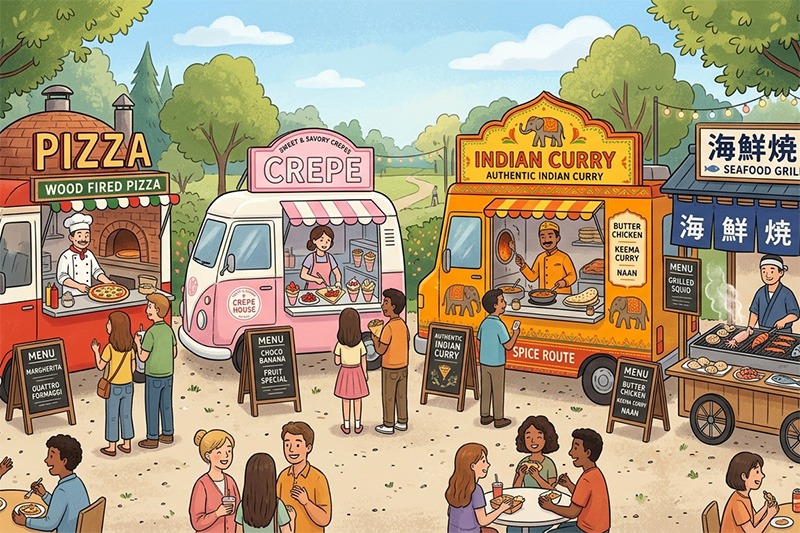 インド料理やピザ、クレープ、海鮮焼きなどがお楽しみいただけます。