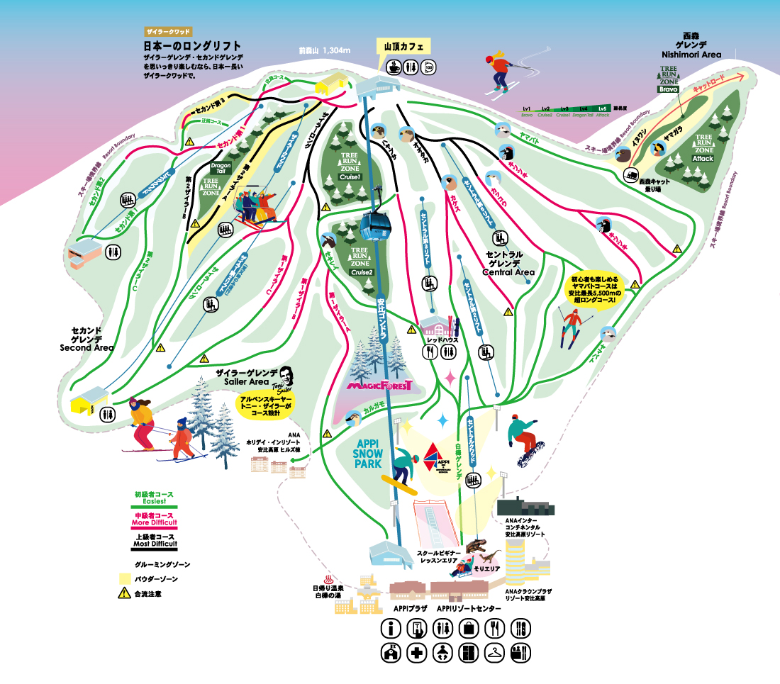 | 第2ザイラーC | 初級 | 2,000m | 50m | 25m | 25° | 10° | 安比で一番の緩斜面。ザイラーエリアへ簡単に! |