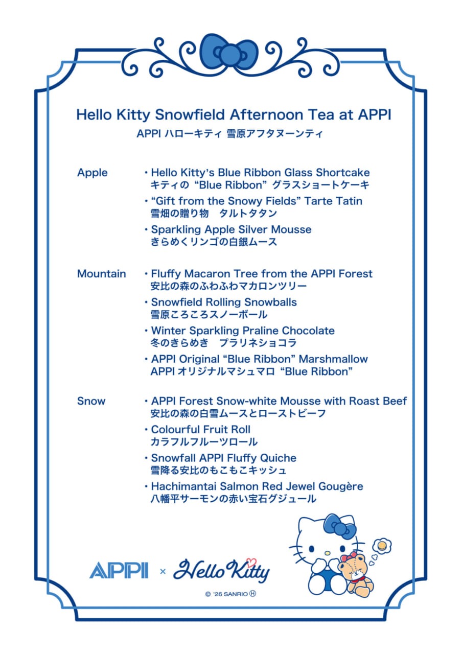 受安比冬日美景启发,充满童趣的甜点华丽地展现了 Hello Kitty 的世界观。特别菜单由 “Apple(苹果)”、“Mountain(山峦)” 和 “Snow(雪花)” 这三个“甜蜜篇章” 构成,其魅力在于洋溢着季节感的美味以及可爱的 Hello Kitty 主题元素。