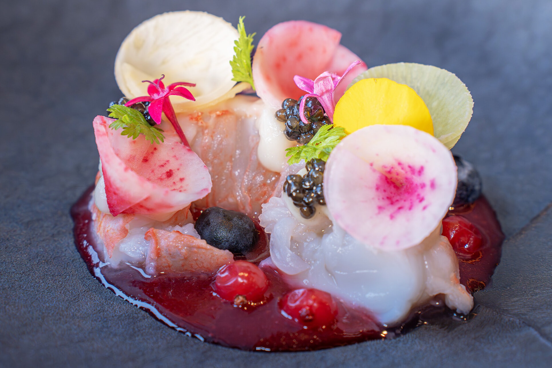 日本龙虾和根菜配浆果沙拉