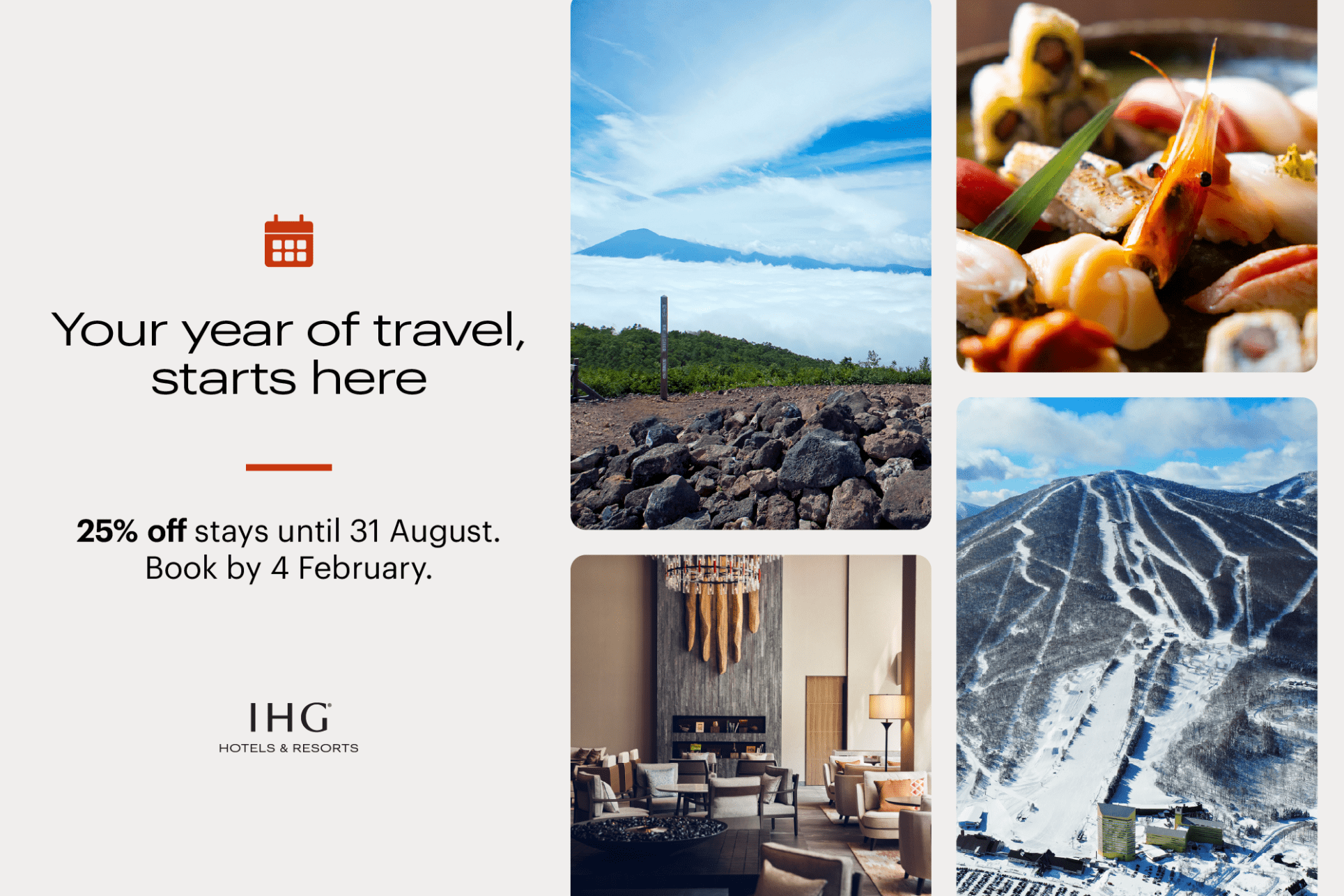 住宿可享75折優惠,截止至2026年8月31日。今年的旅程從這裡開始!預訂截止至2026年2月4日。把握新春促銷,不論是滑雪季、賞櫻季、黃金週、新綠季,或是暑假旅程,都能以超值價格盡情享受。